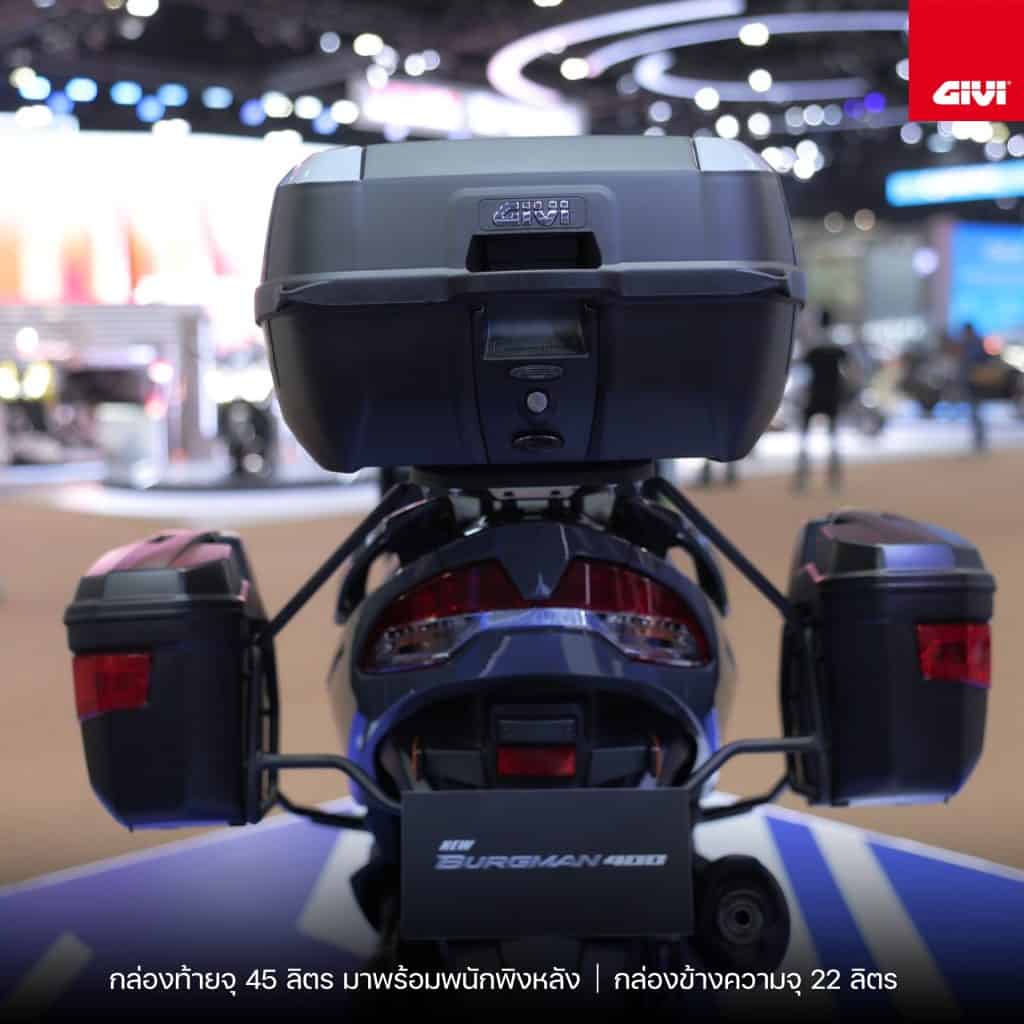 หนึ่งในไฮไลท์ที่สายสกู๊ตเตอร์ทัวร์ริ่งห้ามพลาดในงาน Motor Show 2025 คือ Suzuki Burgman 400 ที่ได้ติดตั้งอุปกรณ์แต่งจาก GIVI เพื่อเพิ่มพื้นที่จัดเก็บและความสะดวกสบายในการเดินทาง